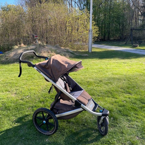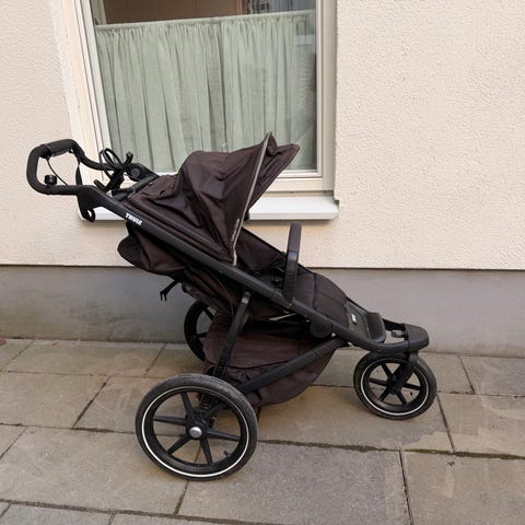 Riktigt bra vagn som man dels kan springa med, men som även funkar kanon som "vanlig" barnvagn. Grym när det är lite terräng eller snö tack vare de stora hjulen. Nu har snön smält, men även riktigt bra vid halka då man kan dra åt handbromsen i nerförsbacke - tryggare med vagn än utan. Framhjulet låser man med en sprint när man ska springa, annars så är det roterbart så att vangen kan vända på en 5-öring när man handlar etc.