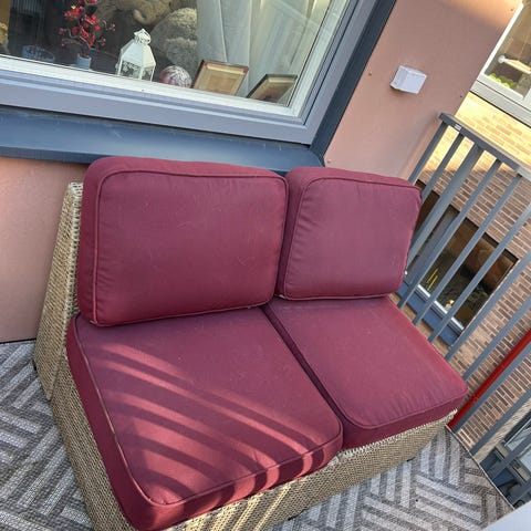Säljer en komplett utemöbel som inhandlades förra våren på Bauhaus för 2499 kr. Har enbart används en vår/sommar och dynor har alltid förvarats inomhus. Dynorna har dessvärre lite tassfläckar på sig med tanke på att vi har en hund, är tvättbara dock så går med stor sannolikhet att få bort. Priset är satt enligt annons med tanke på att dynorna behöver tvättas. Annars i fint skick!