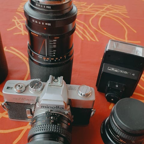 Minolta analog systemkamera med utbytbart objektiv. Kamerahus för 35 mm film med optisk sökare och inbyggd filmtransport. På bilderna syns ett Minolta AF-objektiv 35–80 mm samt ett Sigma-zoomobjektiv, båda med autofokus och manuell fokusering. Kameran har remfästen och bärrem. Passar för analog fotografering med 35 mm film och kan användas med kompatibla Minolta AF-objektiv och tillbehör.