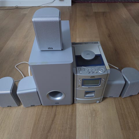 JVC stereopaket med centralenhet och två fristående högtalare. Anläggningen har inbyggd CD-spelare i fronten och display för visning av spår och inställningar. På ovansidan finns knappar för styrning av uppspelning och funktioner. Baksidan har anslutningar för högtalarkablar samt nätanslutning. Färg huvudsakligen silver. Lämplig för uppspelning av musik i hemmet, till exempel i vardagsrum, kök eller hobbyutrymme.