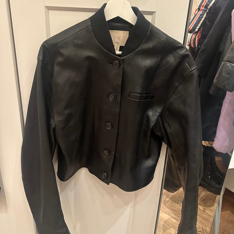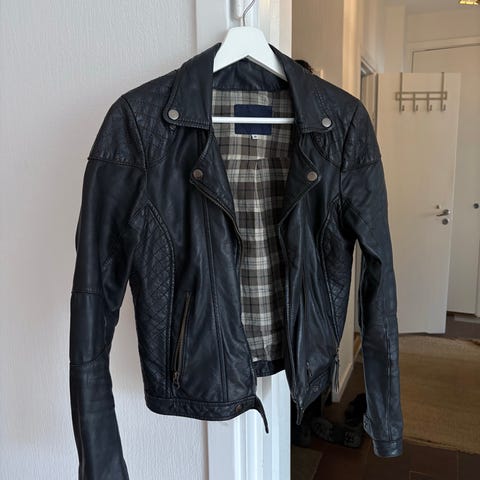Häftig jacka i Kalvnappa för dam i storlek M. Jackan är i svart/ läder med vita kontrastdetaljer och knäppning framtill. Modellen har hög krage och markerade sömmar både fram och bak. Inköpt i Spanien för några år sedan, använd 2 ggr, absolut nyskick, tyvärr växte jag ur den.