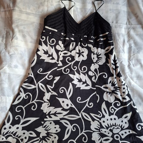 Lång klänning med ett livfullt mönster i svart, vitt, grått, brunt och guld. Klänningen har smala axelband och en smockad rygg för en bekväm passform samt en ögla ifall du vill ha extra stöd för bröstkorgen.Framtill finns en dekorativ fläta som löper längs bysten. Klänningen är helfodrad.Längd 145 cm, mått under bröst 39-40 och elastisk baksida som kan sträcka ut ytterligare.