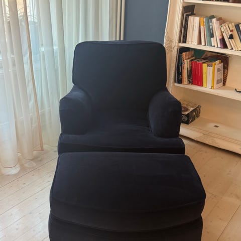 Vit fåtölj i Howard-modell från Englesson. Avtagbar och tvättbar klädsel.