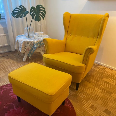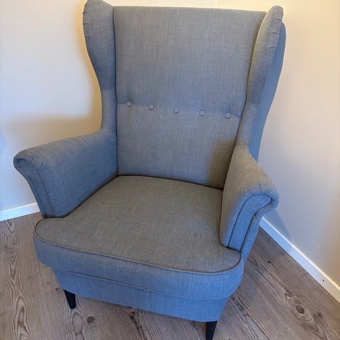 IKEA Strandmon fåtölj i ljusgrå tygklädsel. Klassisk öronlappsfåtölj med högt ryggstöd och armstöd. Extra klädsel i ljusbeige, lite använd, medföljer. Passar som sittplats i vardagsrum, läshörna eller sovrum. Ben i trä som lyfter fåtöljen från golvet och ger ett luftigt intryck.