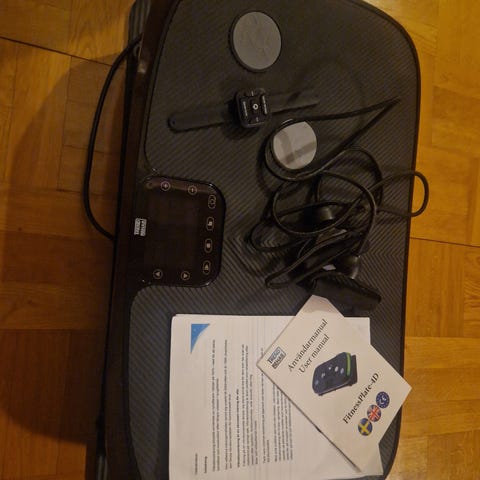 Vibrationsplatta för hemmaträning med strukturerad ståyta och integrerade massagepunkter. Utrustad med digital display och kontrollpanel samt fjärrkontroll för att justera program och intensitet. Medföljande träningsband och kablar möjliggör olika typer av styrke- och balansövningar. Lämplig för användning inomhus på plant underlag för träning av ben, bål och balans.