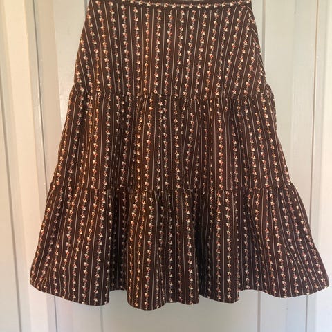 Kjolen har ett klassiskt prickigt mönster och knappar i midjan. Den är designad med en utsvängd passform som ger en elegant silhuett.