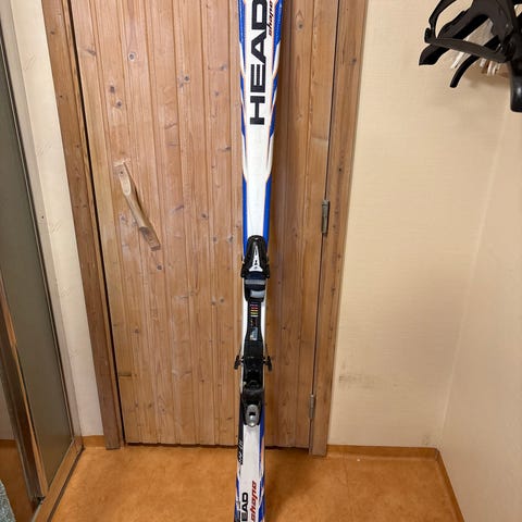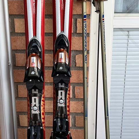 Atomic Nomad TI skidor med längd 162,5 cm. Skidorna har lätt träkärna och är förstärkta med titan (titanium powered). Midjemått enligt märkning 76 mm och radie 13,5 m. Färgkombination i svart och rött med integrerade bindningar monterade på skidorna. Passar för piståkning.