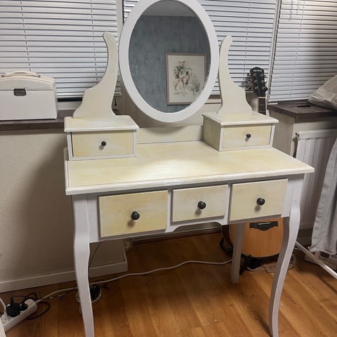 Spegeln har lite mjölkigt utseende bättre än bilden - men för bästa funktion bör den bytas! Skrivbordet är gediget och riktigt trä.
