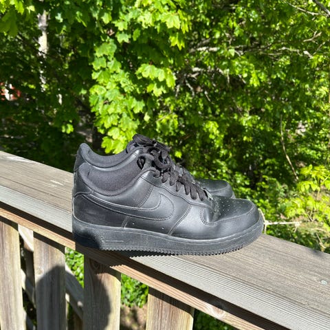 Nike Air Force 1 sneakers i storlek 43. Modellen är helvit med ovandel i läder och klassisk gummisula. Perforerad tå för ventilation och snörning framtill. Passar som vardagssko och fritidssko.