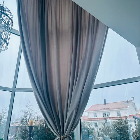 Höjd 275 cm. Extra tygmån finns för dig som önskar längre gardiner.