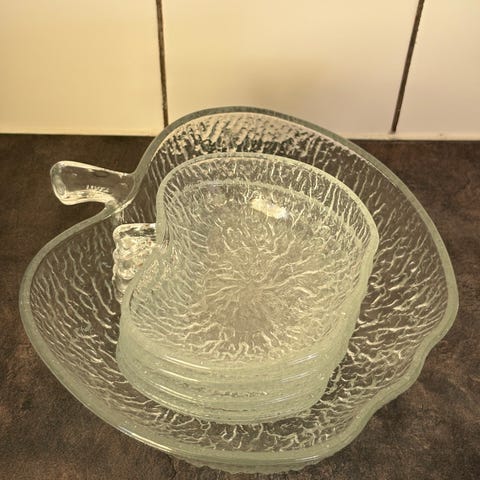 Glasskålar i äppelformad design. Setet består av en större serveringsskål och flera mindre skålar i genomskinligt glas med strukturerad yta. Passar för servering av exempelvis dessert, snacks eller sallad. Klassisk formgivning som kan kombineras med annat glas och porslin i köket eller på matbordet.