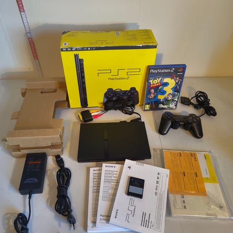 Sony Playstation 2 spelkonsol i svart utförande. Konsolen är den slimmade varianten och används för att spela Playstation 2-spel. På bilderna syns en handkontroll, strömkabel och videokabel samt spel i originalfodral. Konsolen är avsedd för anslutning till TV och kan användas för en spelare eller flera spelare beroende på spel och tillbehör.