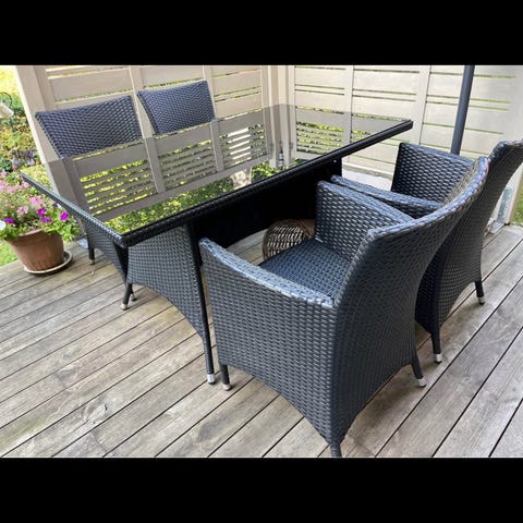 2 Trädgårdsstolar och runt trädgårdsbord för utomhusbruk. Stolen är i grå plast med flätad rottinglook och har armstöd. Bordet är runt med vitlackerat metallunderrede och bordsskiva med ribbad design. Passar som enkel utegrupp på altan, balkong eller i trädgård.