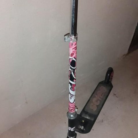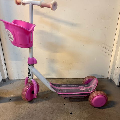 Rosa sparkcykel med justerbart styre och två hjul. Fotplattan har halkskydd och bakhjulet är utrustat med fotbroms. Passar för barn som vill ta sig fram kortare sträckor eller leka utomhus på plana underlag.