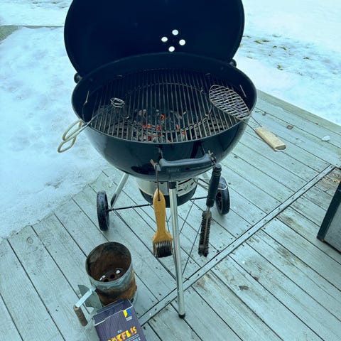 Weber kolgrill, har aldrig använts men stått ute senaste åren. Från kanske 2020 ungefär. Du får med alla verktyg och liknande. Du tar den som den är, kan behöva lite rengöring möjligen.
