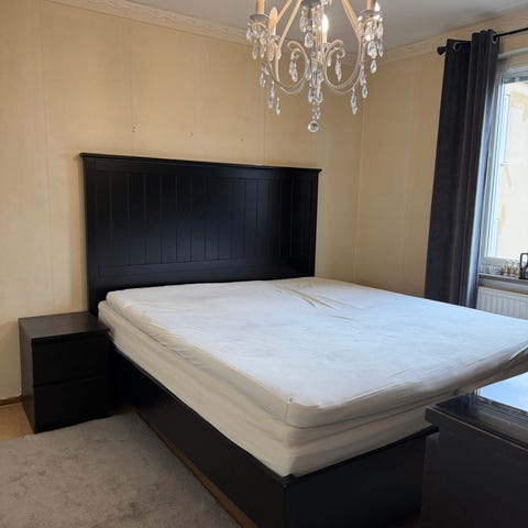 IKEA säng med hög gavl i svart träutförande. Sängen har en massiv huvudgavel med vertikala spår och en ram i samma färg. Madrasser ingår.