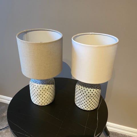 2st gula bordslampor med vit skärm i större storlek. Svart sladd. Fungerar.