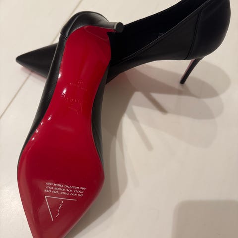 Christian Louboutin finskor i storlek 36. Klassiska pumps med hög klack och spetsig tå. Skorna är i svart lack med röd sula. Passar som eleganta klackskor vid fest, högtider eller andra mer uppklädda tillfällen.