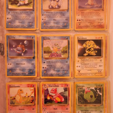 Pokémon samlarkort i plastficka med nio olika kort. Motiven visar olika Pokémon-figurer från spelet/serien. Kortens språk verkar vara engelska och de är placerade i en genomskinlig samlarficka för förvaring. Passar för samling, byte eller spel med Pokémon Trading Card Game.
