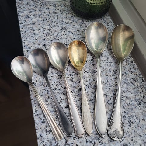 Design: Hamrad finish på gaffelns och skedens huvud, med en dekorativ snäcka eller spiral i handtagets ände.