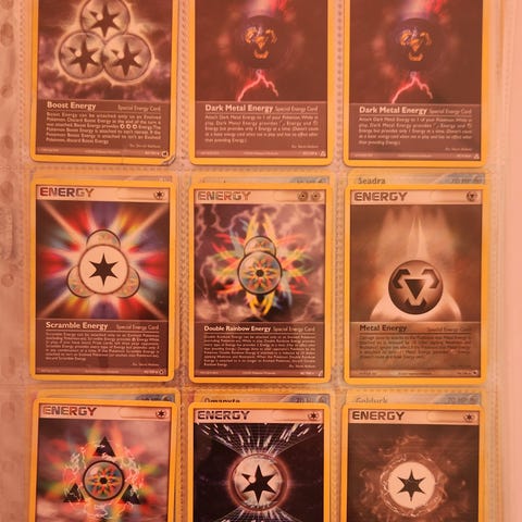Pokémon samlarkort special energy i holografisk och vanlig utgåva. Flera olika specialenergi-kort visas i en samlarpärmssida, bland annat Double Colorless Energy och andra specialenergier. Kortens språk verkar vara engelska. Passar för samling eller spel i Pokémon Trading Card Game.