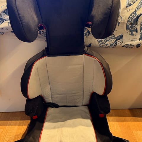 Bilbarnstol med avtagbart ryggstöd. Lämplig för 4-10 år. Avtagbar klädsel. 2 mugghållare som kan fällas in. Har ej varit med om krock. Kan användas med eller utan ryggstöd. Lätt att flytta mellan bilar då den fästes med ordinarie bilbälte.