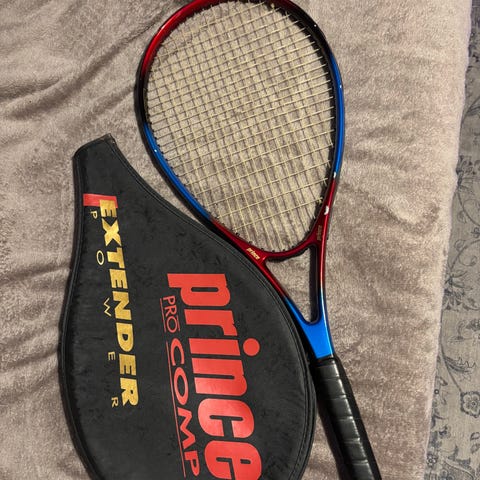 Wilson Hammer Comp tennsracket med tillhörande fodral. Racketen har svart och blå ram med strängar och stort Wilson‑logotyptryck i röd färg i racketens träffyta. Handtagets tejp måste bytas. Handtaget har grepptejp och racketen levereras tillsammans med ett skyddsfodral märkt Wilson Hammer 25 med axelrem för enkel transport och förvaring. Passar för spel på tennisbana, träning och fritidsspel.
