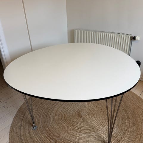 Fritz Hansens runda bord skapat av Piet Hein, Bruno Mathsson och Arne Jacobsen i vitt utförande och underrede i metall.