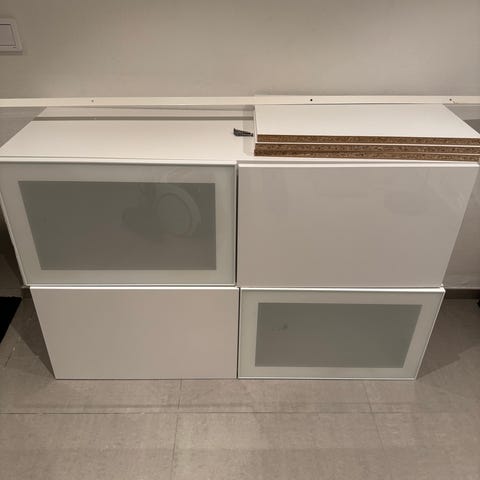 Med ben, hyllor och glasdörrar