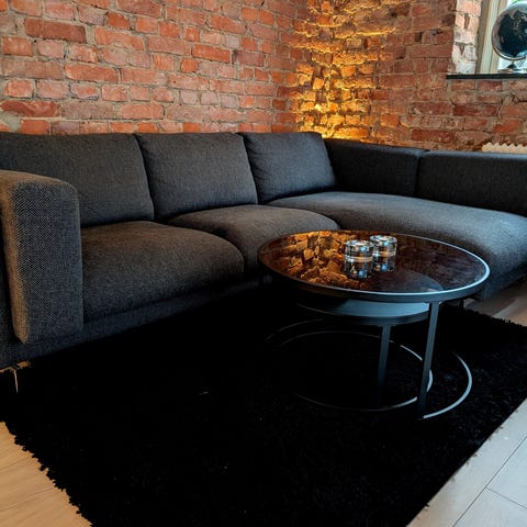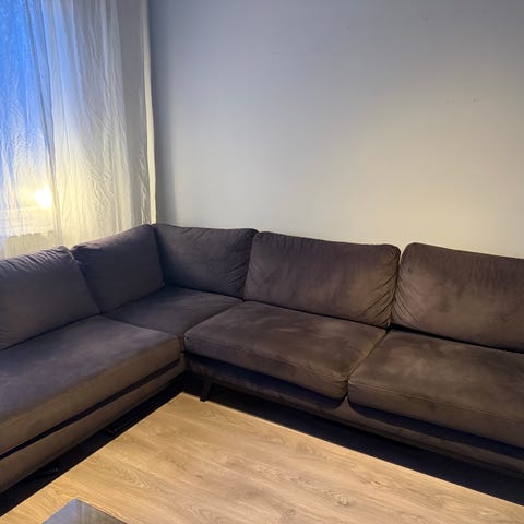 Jättestor hörnsoffa. Antracitgrå kraftigt tyg. 315/250 cm. Inköpt på XXXlutz. Kostade ny över 20000. Idag kan man hitta liknande fast mindre för strax under 14000.