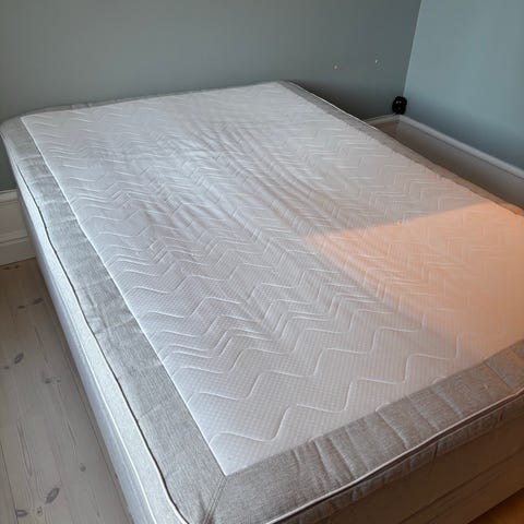 105 cm bred säng. Nästan ny bäddmadrass medföljer.