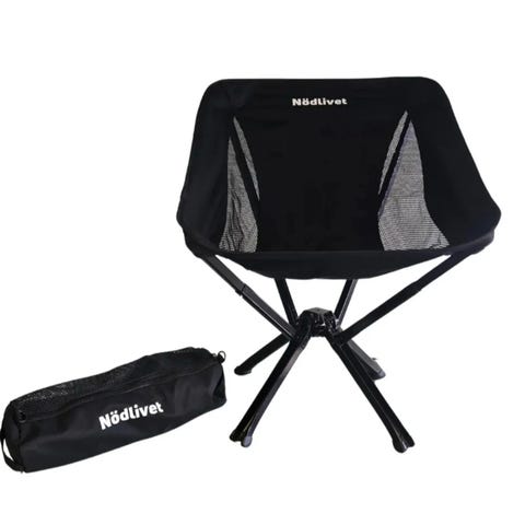 Nödlivet hopfällbar campingstol i svart färg. Stolen har kryssformat stativ och sits med meshpaneler i sidorna för ventilation. Levereras med matchande förvaringsväska som kan packas kompakt. Passar för användning vid camping, fiske, utflykter och andra utomhusaktiviteter där en lätt och portabel sittplats behövs.