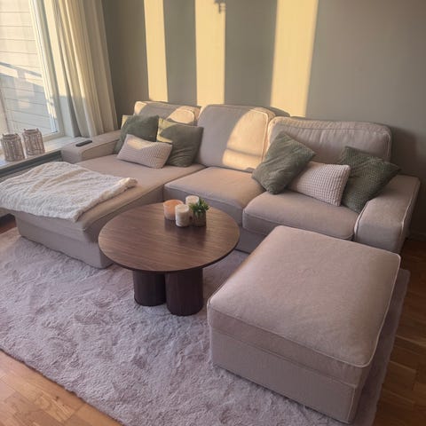 Jätteenkel att rengöra. Soffan har fläckbehandlats samt med möbeltvätt och sittdynorna/kuddfodralen är tvättade. Kommer från ett djur- och rökfritt hem.