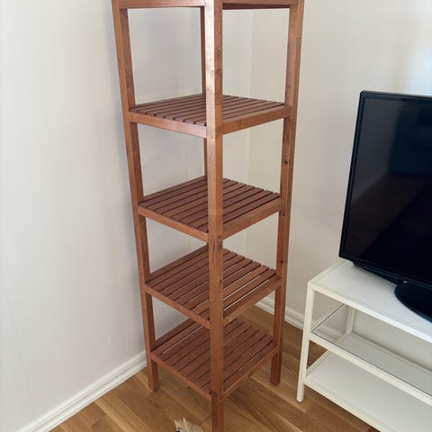 Badrumshyllan av träd säljs på grund av flytt! Modell Muskan från Ikea. Lite vattenskador på benen från vatten på golvet men inget farligt.