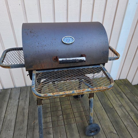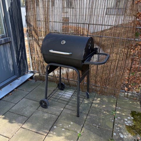 Kolgrill i stående modell i svart metall. Locket har inbyggd termometer och handtag framtill. Invändigt finns två grillgaller i olika nivåer för direkt och indirekt grillning. Grillen har front- och sidobord i metallgaller samt underhylla för förvaring av grilltillbehör eller kol. Passar för utomhusbruk på altan, uteplats eller i trädgård.