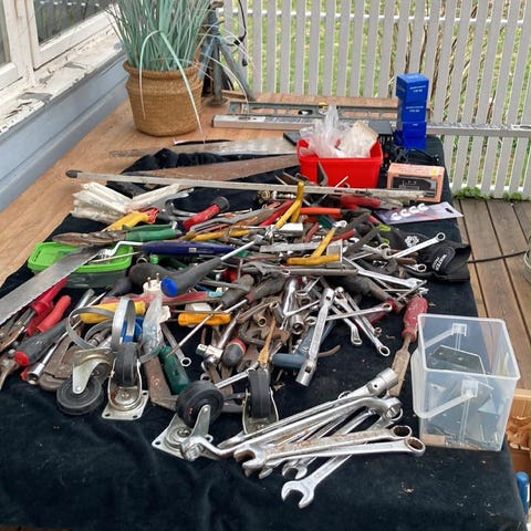 Flera skruvstycken i metall. Blandade storlekar och modeller, både bänkmonterade och fristående varianter. Passar för fastspänning av arbetsstycken vid metall- och träarbete i verkstad eller garage. Säljs som parti enligt bilder.
