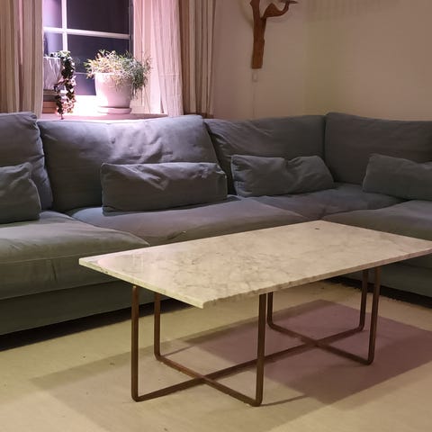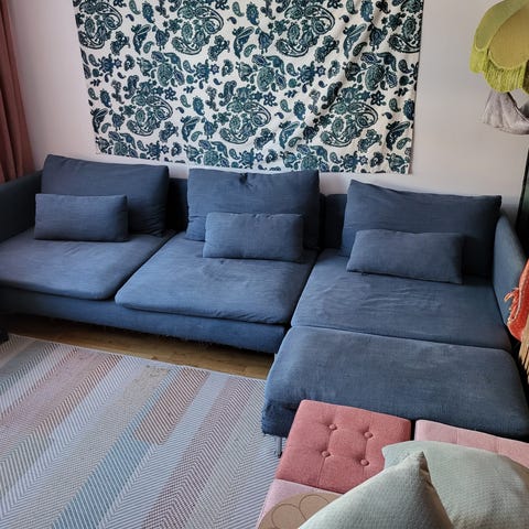L-soffa högerställd med fotboll i dun från Folkhemmet. 32 000 kr nya. Inga skador.