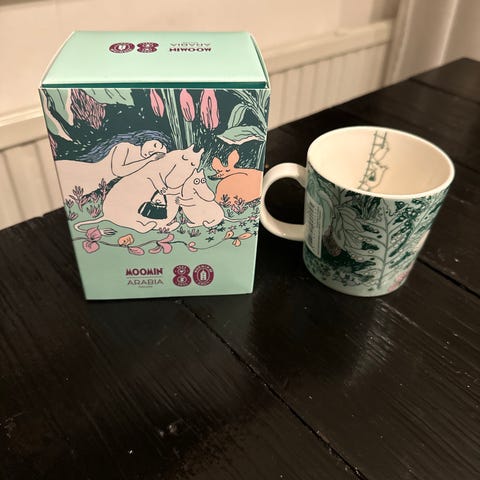 Arabia Muminmugg jubileumsutgåva. Porslinsmugg med Mumin motiv i flerfärgad dekor, levereras i illustrerad presentförpackning. Passar för servering av varma och kalla drycker i kök och vardagsrum eller som prydnad.