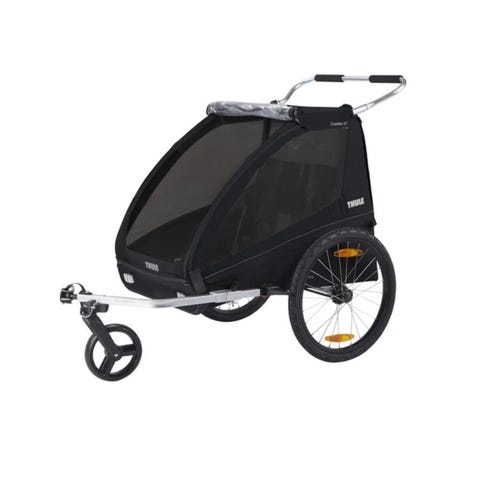 Thule Coaster XT cykelvagn i blå färg. Vagnen är utrustad med två sittplatser med individuella säkerhetsbälten. Stora hjul med reflexer ger stabilitet och synlighet i trafiken. Vagnens sidor har stora fönster för insyn och ljusinsläpp. Passar för transport av barn bakom cykel och kan användas vid vardagscykling eller utflykter. Konstruktionen är gjord för att kopplas till cykel med dragarm framtill.