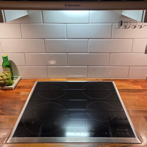 Induktionshällen har fyra kokzoner markerade på glasytan. Fronten är utrustad med touchkontroller och en steglös effektinställning från låg till hög nivå. Panelen visar symboler för bland annat timerfunktion.