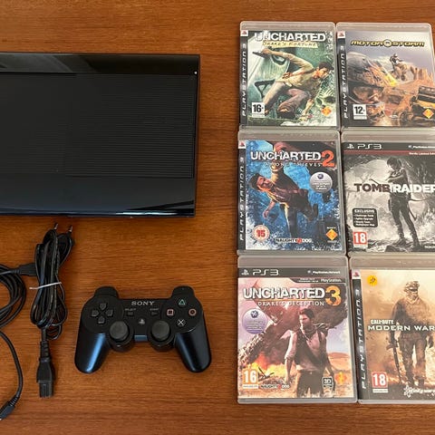 PS3 Slim med kontroller och många tillbehör och 31 spel