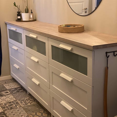 Skåpen har fått ett lyft med utbytta beslag i läder samt toppskiva i ek, vilket ger ett exklusivt och modernt intryck.