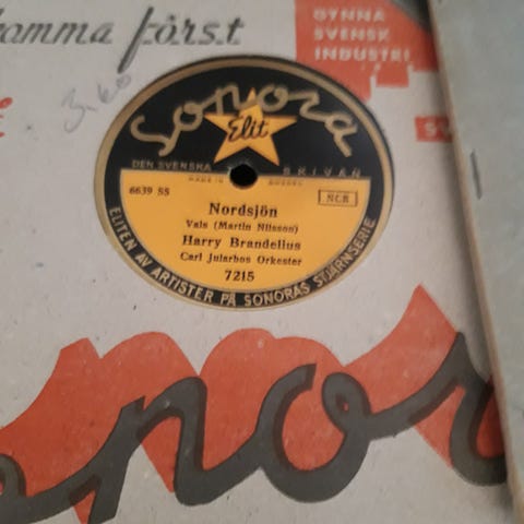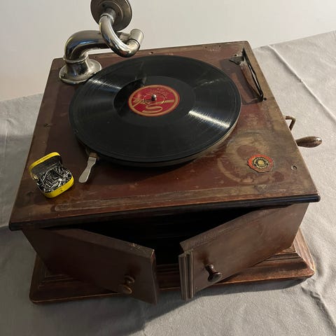 Portabel vevgrammofon i låsbar trälåda med bärhandtag. Grammofonen drivs med vev och har inbyggd tonarm och ljudtratt under locket. Skivspelaren är avsedd för stenkakor/78-varvsskivor. Utsidan har ett mönstrat brunt ytskikt och metallbeslag i hörnen. Passar som fungerande bruksföremål om den är i spelbart skick eller som inredningsdetalj och samlarobjekt. 1920-talets grammofon företag caruso allt fungerar bra en grammofonskiva medföljer.