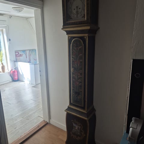 • Datering: Att döma av mässingsurtavlans stil och den svängda huven ("swan neck pediment") högst upp, är din klocka troligen tillverkad runt 1780.