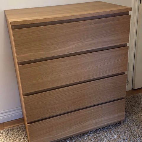 Hög MIO-byrå i ek med 5 bredare lådor och 2 smalare längst upp. Ca 32cm djup så passar bra i många rum. Varsamt använd