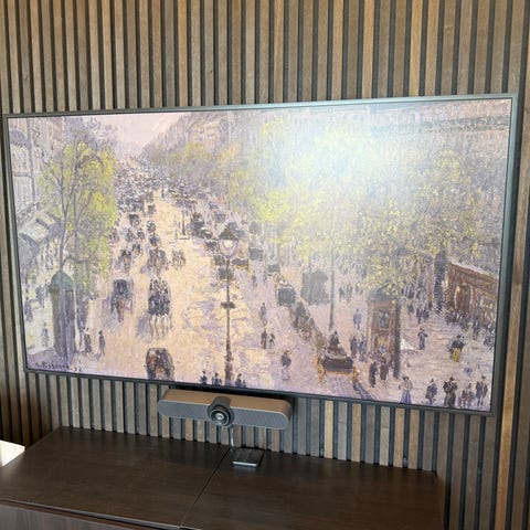 TV:n är utformad för att kunna visas som en tavla på väggen och kan visa konstmotiv när den inte används som TV. Ramen i trä/beige ton ger ett diskret och neutralt intryck som passar i många inredningsstilar.