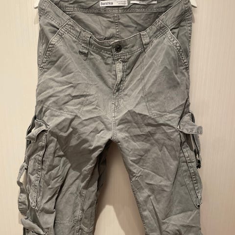 Byxor khakifärg, stl 40L, längd 105 cm bredd midja 43 cm, bomull. Märke EDC, skärp ingår, bra skick. Två fickor fram, två fickor bak. Långa ben. Två längder, vik upp och knäpp fat så har du längd nedanför knä.