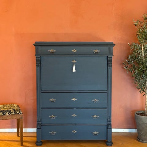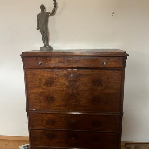 Gammal gedigen solid trämöbel från 1800-talet med 3 rymliga låsbara lådor nertill och en utfällbar praktisk låsbar skrivskiva upptill. Tre mindre lådor på varje sida om ett litet utrymme med dörr och en bredare låda nertill. Fina guldfärgade handtag och låsbrickor. Överlag, fin patinerad och åldrad yta, men fernissan har krackelerat lite och det finns lite små skavanker/slitage här och där som tillkommit under årens lopp. Möbeln är solid och tung och låset till skrivskivan behöver lite kärlek. Möbeln har gått i arv genom släkten och stått länge på Alnön.