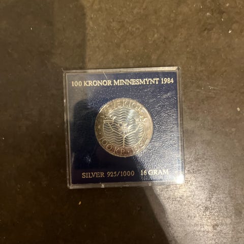 Riksbanken minnesmynt 200 kr från 1998 i silver. Myntet är ett svenskt minnesmynt präglat i silver 925/1000 och väger 27 gram. Framsidan visar ett porträtt av Sveriges kung, med text som markerar kungens 25 år som regent. Baksidan har riksvapnet och valören 200 kr. Myntet ligger i en fyrkantig plastkapsel med svart bakgrund, där årtal, valör, metallhalt och vikt framgår. Lämpligt som samlarobjekt för svenska mynt och minnesmynt i silver.