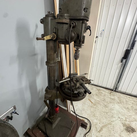 Arboga 2508 pelarborrmaskin i grön metall. Maskinen är trefasdriven och har flera valbara varvtal enligt tabell på sidan, från låga till höga varvtal för olika typer av borrning. Utrustad med höj- och sänkbart bord, matarspak och chuck för borr. På bordet sitter ett skruvstycke för fastspänning av arbetsstycken. Passar för borrning i metall, trä och andra material i verkstad, garage eller hobbybruk där en stabil pelarborrmaskin behövs.